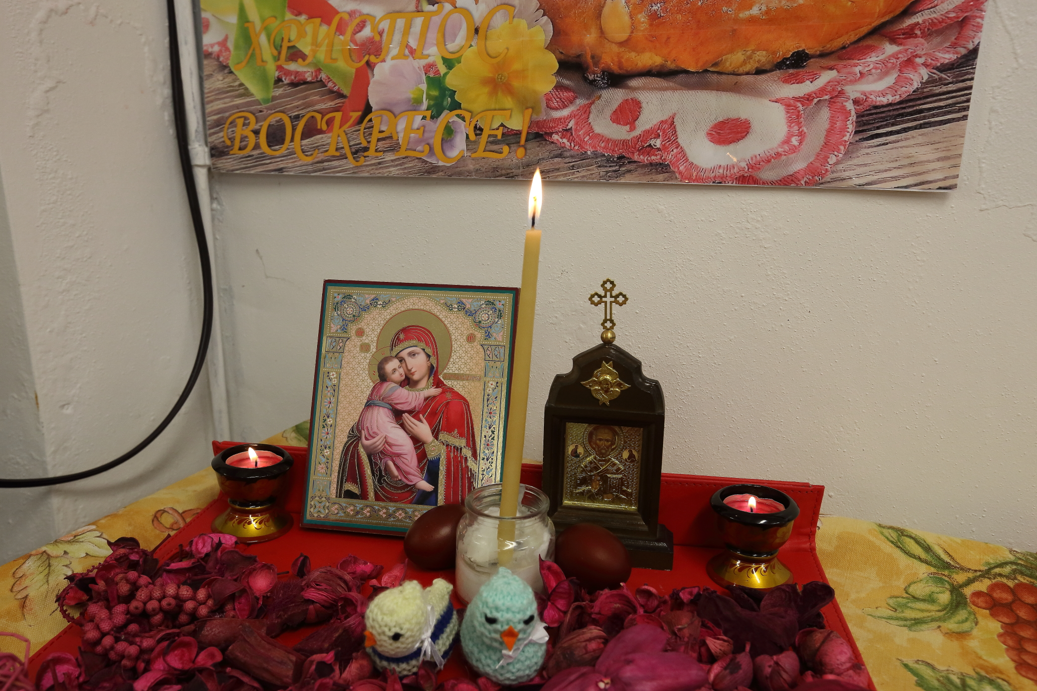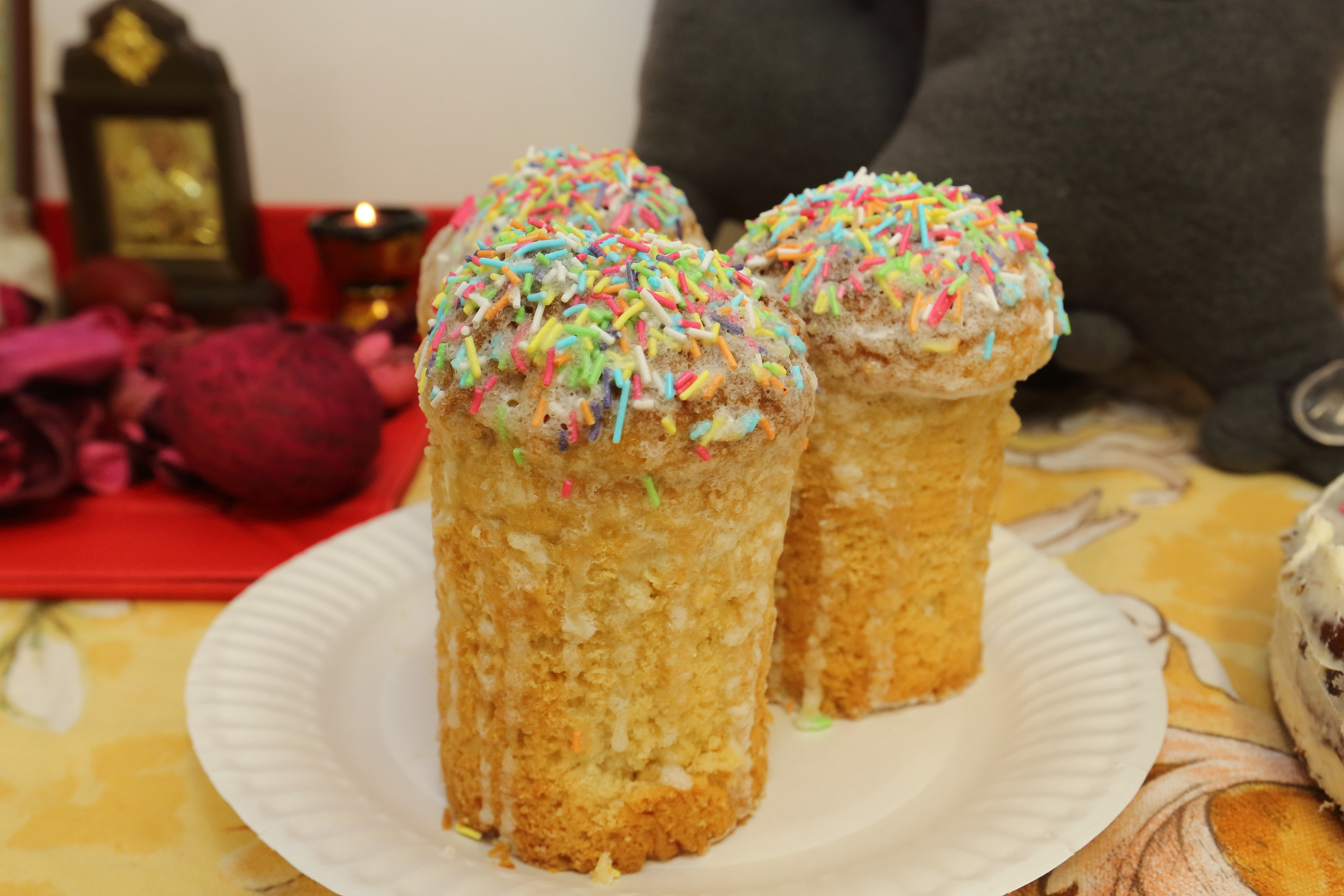 Some of the group had also been baking kulich (кули́ч) which is referred to as an Easter bread. It is only eaten around this period but as it contains elements of fruit, and drizzled with icing it tastes more like a cake. This is very traditional in the Orthodox Christian countries of the region. A small display was placed in the café which included Christian icons, candles and the sign Христос воскресе ( Christ is Risen).