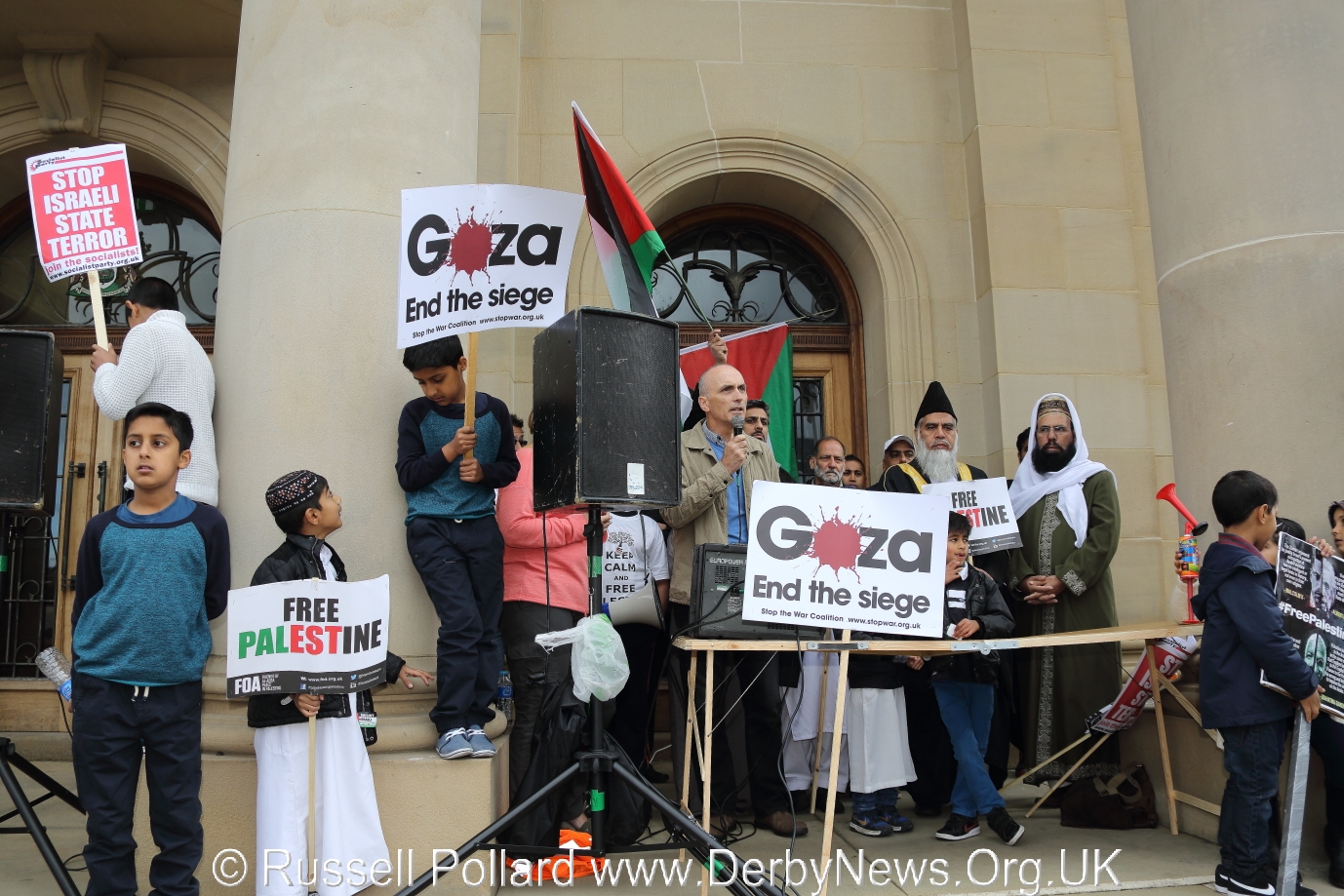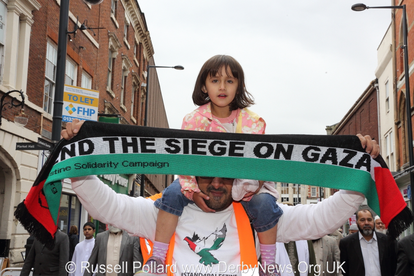 6X4A8307DerbyNews_wm2 weeks after a national demonstration in London in support of the Palestinians in Gaza, Derby held its own version on 23 August 2014. The group of about 150 people, mainly Muslims, gathered outside the Jamia Mosque on Rose Hill Street in Arboretum/Normanton. The march left at about 11.30am and made its way up Normanton Road towards the Council Offices, where a rally was held. There were many speakers including people from the Mosque, Councillors, MP’s, and representatives from the organizing groups of Derby People’s Assembly and Indian Worker’s Association.