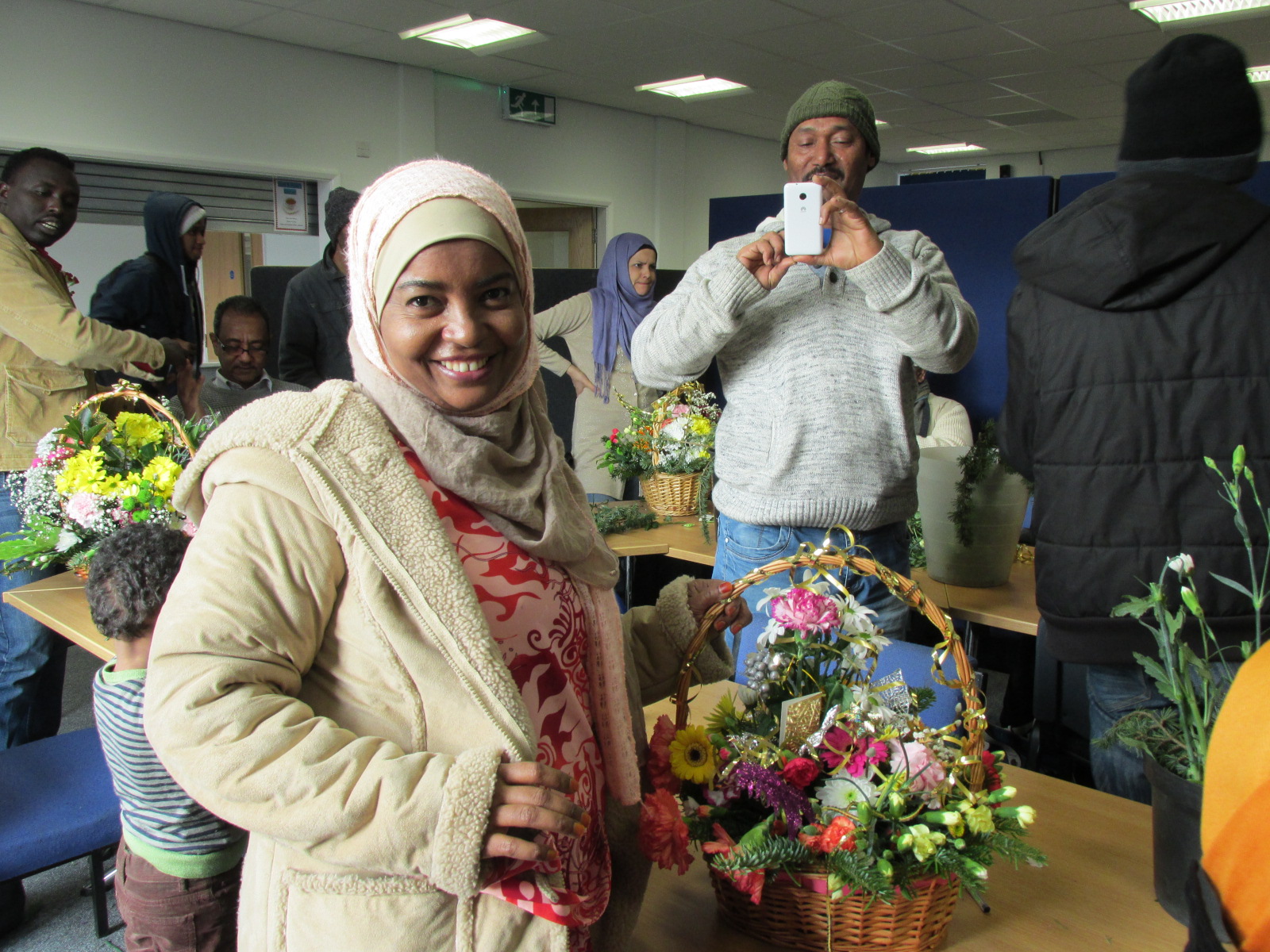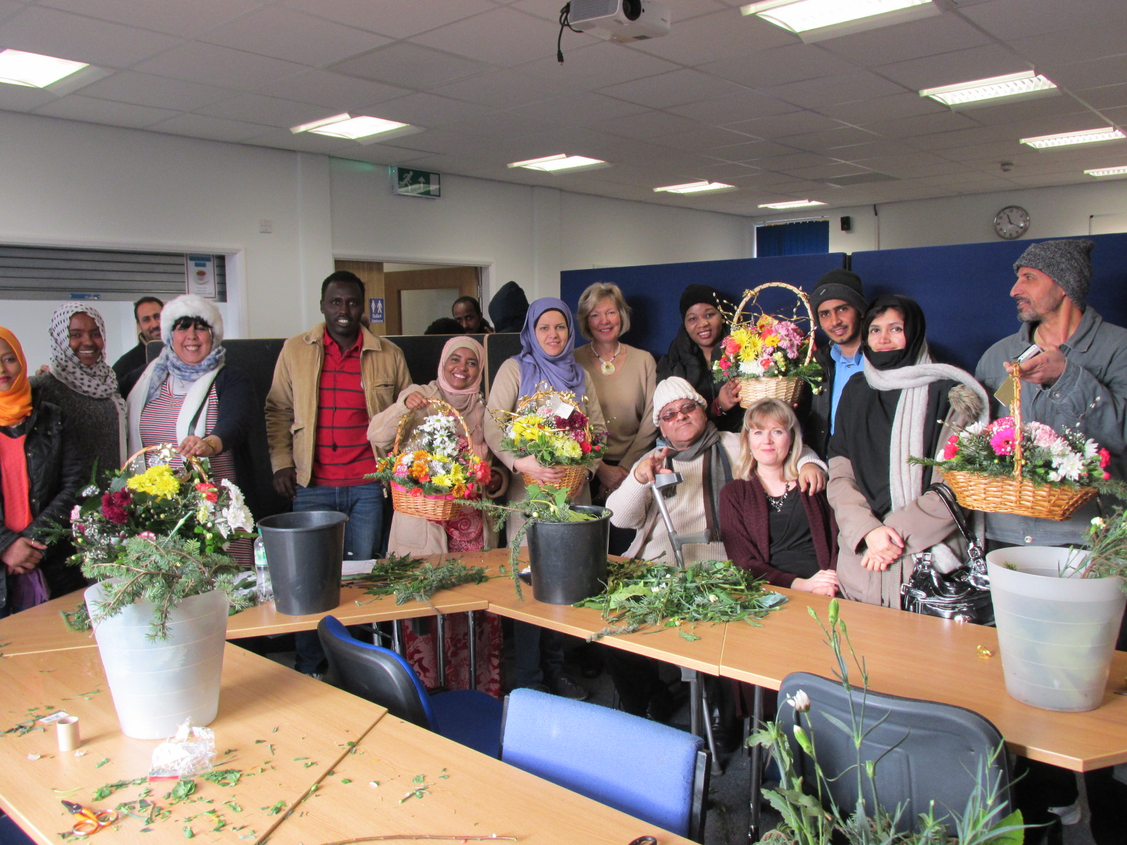 Developing this theme further, she put another workshop on for “Flower arranging”. This might not have seemed to have been suitable for all, but in fact both men and women enjoyed the opportunity to be creative. There were 21 clients taking part, from countries including Syria, Kuwait, Zimbabwe, Sudan, Pakistan, Eritrea, Iran and South Africa. The 2 tutors donated their time free of charge, and also brought the flowers as well. Hannah managed to find some other materials including glitter to give some extra sparkle to the creations. Her idea then went one stage further, and she arranged to donate the bouquets to 3 dementia care homes, one for young people with mental health issues, and the Padley homeless hostel. It highlighted to the clients that there were people existing within the Derby community who were also vulnerable for different reasons.