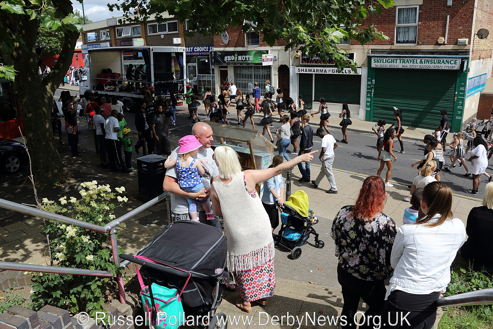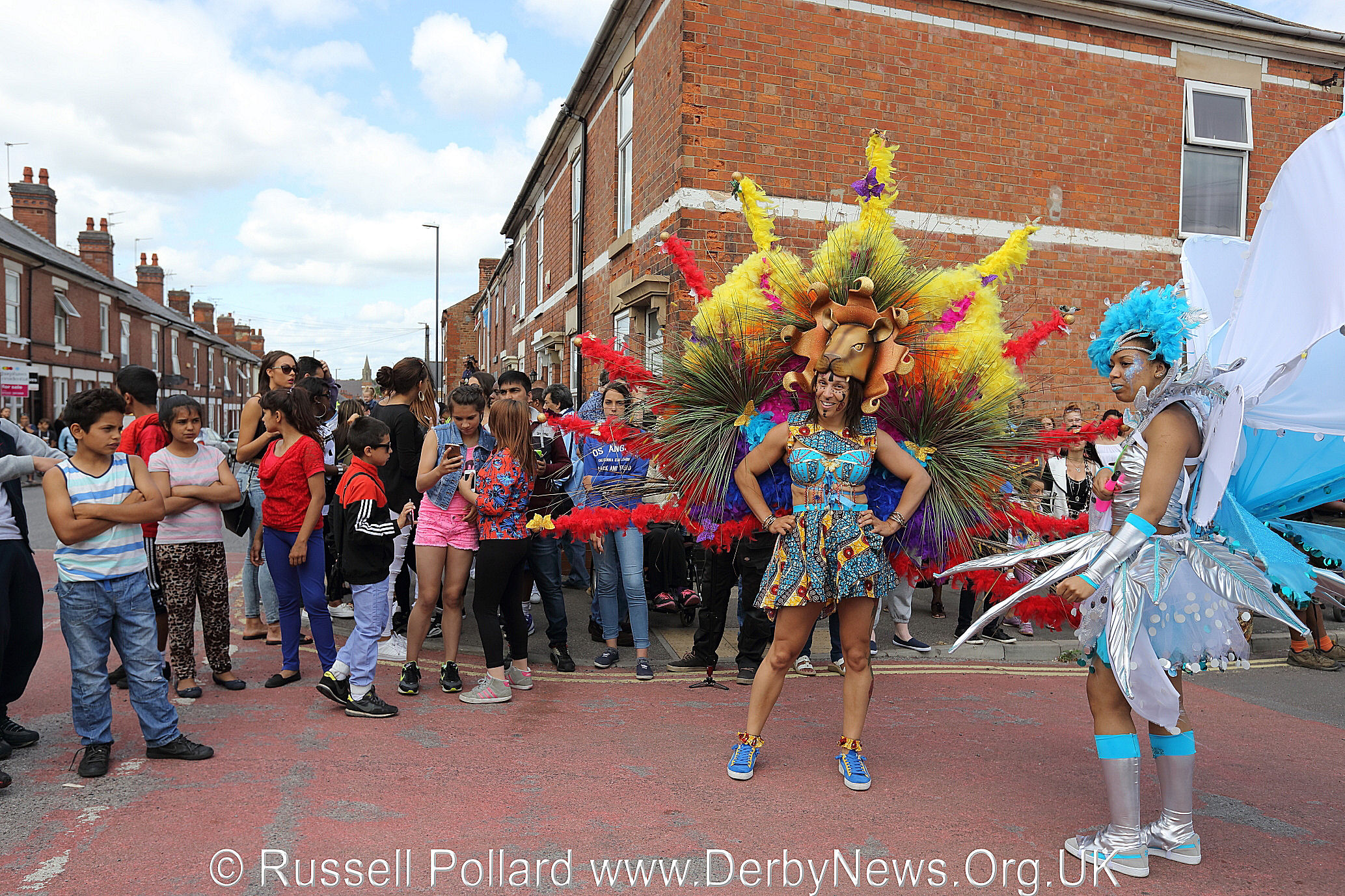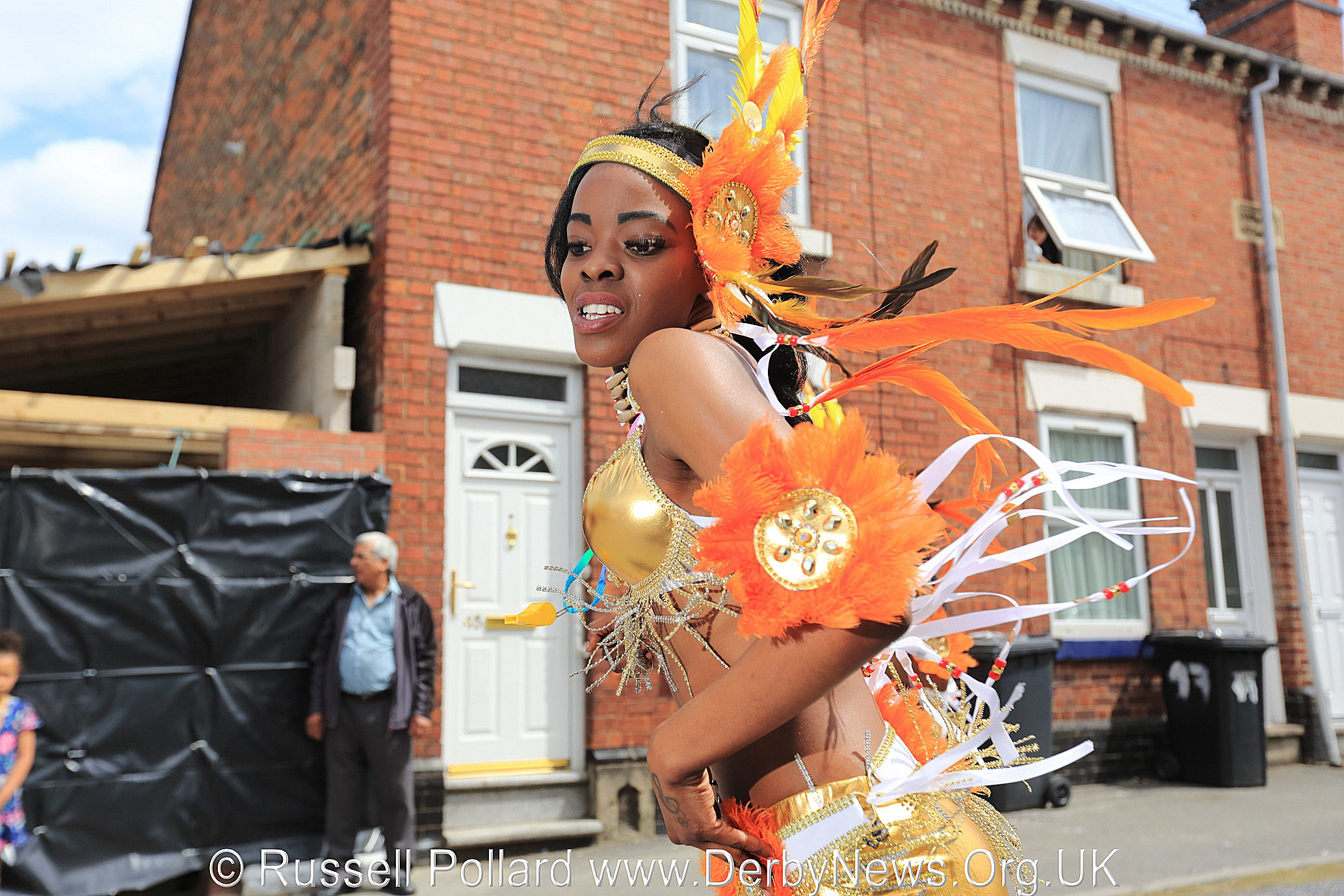 With floats and dancers from different parts of the UK, the parade started at Pear Tree school in Normanton and then made its way along Pear Tree Road, Normanton Road, into the town centre and then to Market Place. A crowd had already gathered around an arena near to the QUAD and were waiting patiently for the dancers to arrive. Each of the troops had 5 minutes in front of the audience to show off their elaborate costumes, and entertain them with their dancing. Thankfully the weather was very favourable and brought the crowds out who enjoyed the full colour and glamour of the occasion.