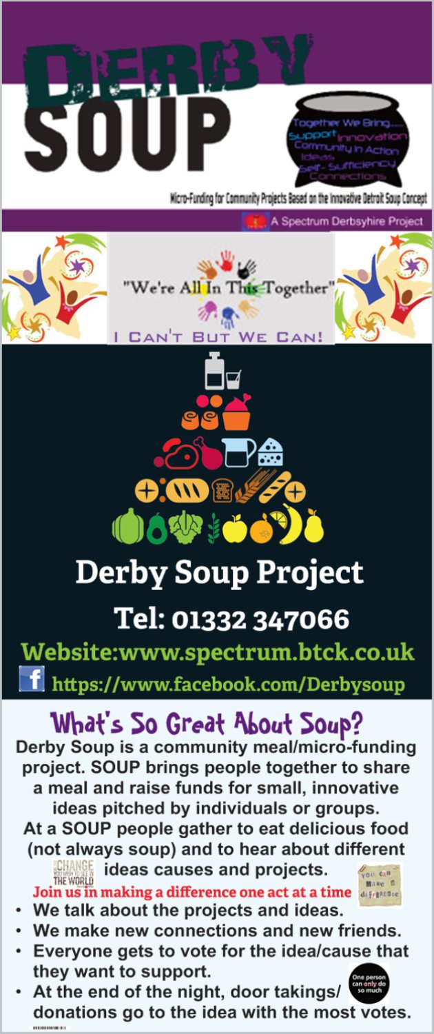 Derby Soup is a project established by Spectrum Derbyshire based at the Mandela Centre on Pear Tree Road. The inaugural Soup will be on the 30th from 6.00pm in the Heart of the Park ( next to the café), in Arboretum Park.