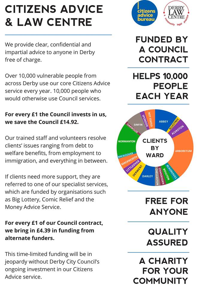 The Council’s presentation to themselves, and the people in the City, only concentrates on one part of the equation – the cost. Anyone who knows anything about financial decision making knows that you must include all relevant costs and all relevant benefits for a competent decision to be made. By totally ignoring the benefits, confirms my view that the Council does not know how to make such decisions, have their own eye firmly focussed on a political agenda, and are using the Citizen’s Advice Bureau, as well as the other Voluntary Sector Organisations, as part of their cynical political strategy – the losers being the vulnerable residents of Derby – the very people they claim to be representing.
