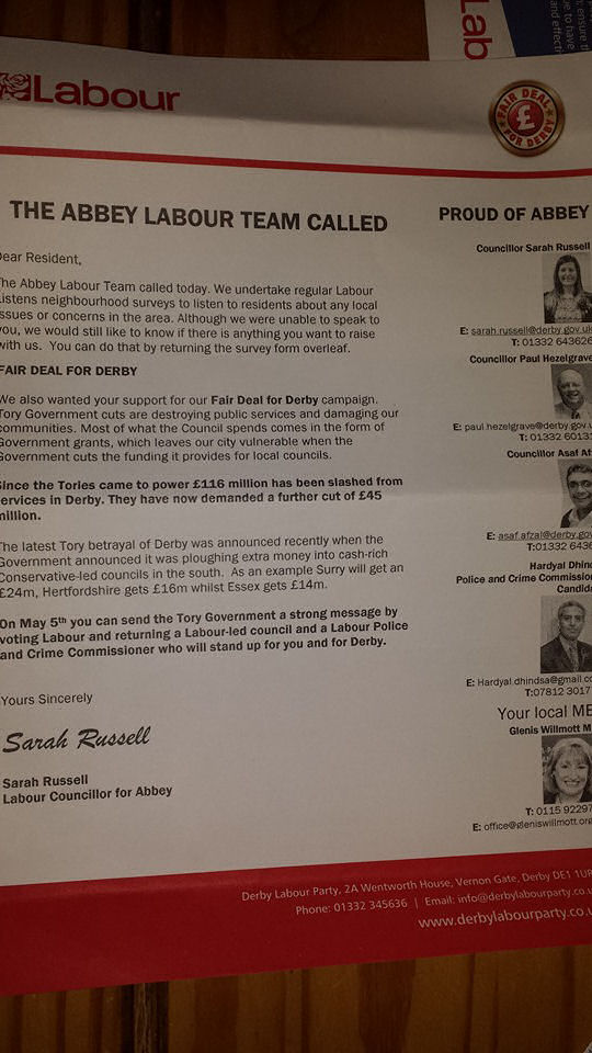 Derby Labour Party is handing out leaflets which state “Since the Tories came to power £116m has been slashed from services in Derby. They have now demanded a further cut of £45m”. This is also on their website.