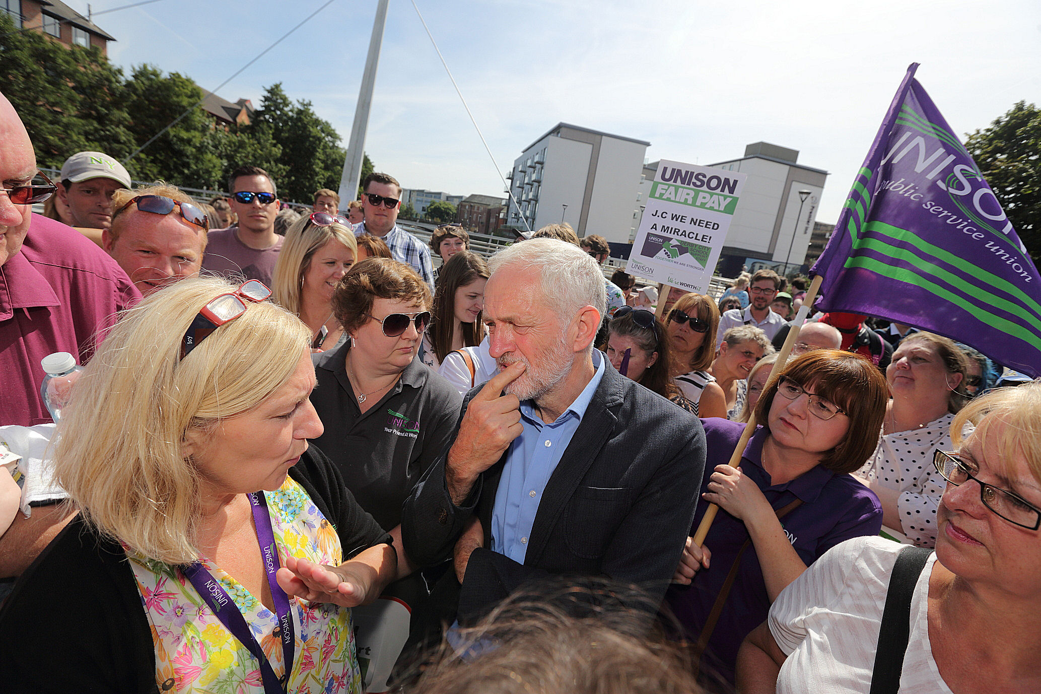 Shortly after, he made his way to Nicole Berrisford, and the group of UNISON members / Teaching Assistant / Support Staff. Nicole explained in detail the nature of the dispute, the poor communications with the Council, how the changes to the working week / working year and Job Evaluation had resulted in cuts of up to 25% to many of her members. He recognised the basic similarity with the Durham TA dispute. Corbyn was asking how the national UNISON were involved and shared his personal knowledge of the value of Teaching Assistants – his son is ( or was) a TA. The conversation went on for 5-10 minutes, and Corbyn’s engagement was one of genuine concern based on an informed understanding. He was not making comments to placate the audience – in fact although many were listening intently it was simply a dialogue between Nicole and Corbyn.
