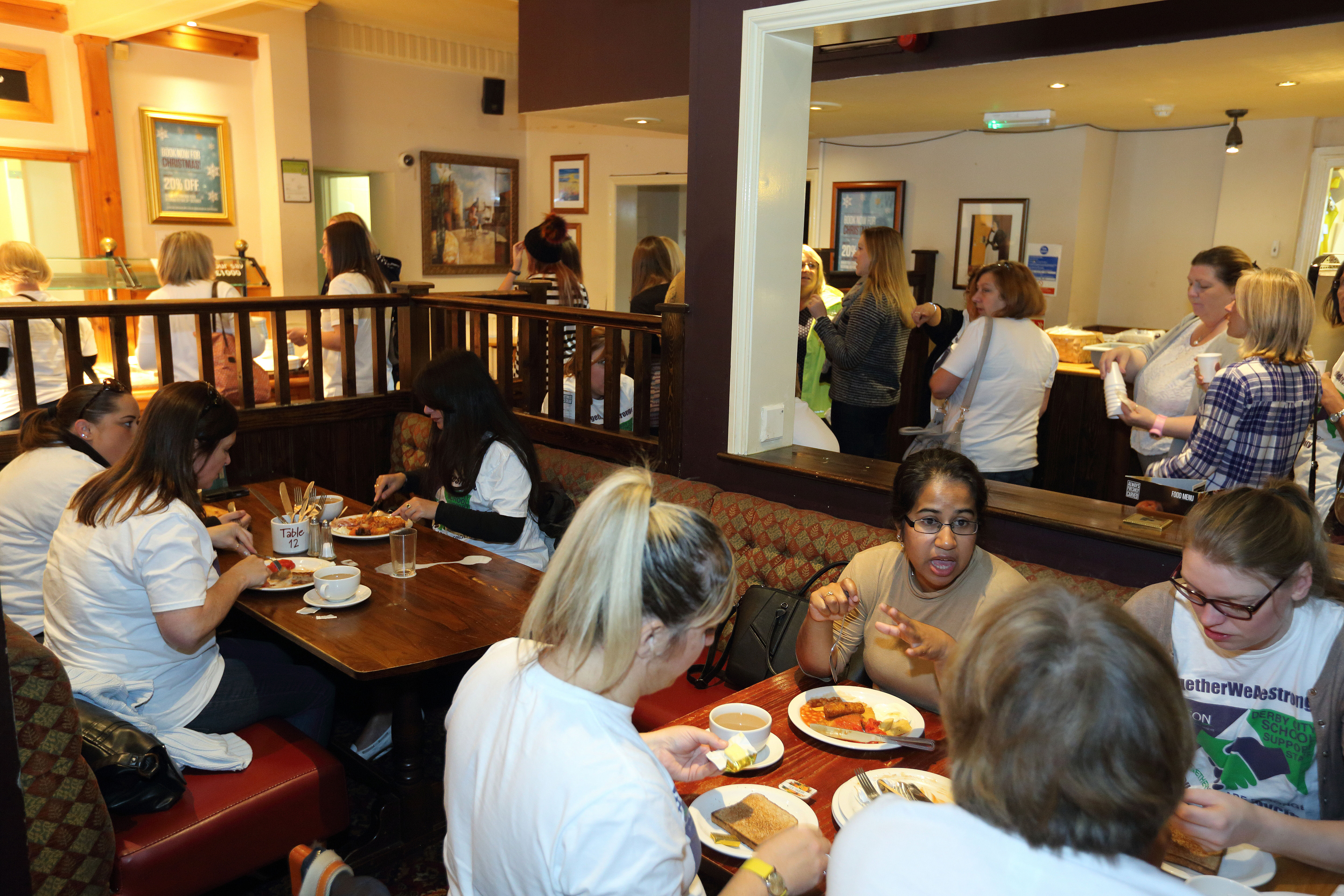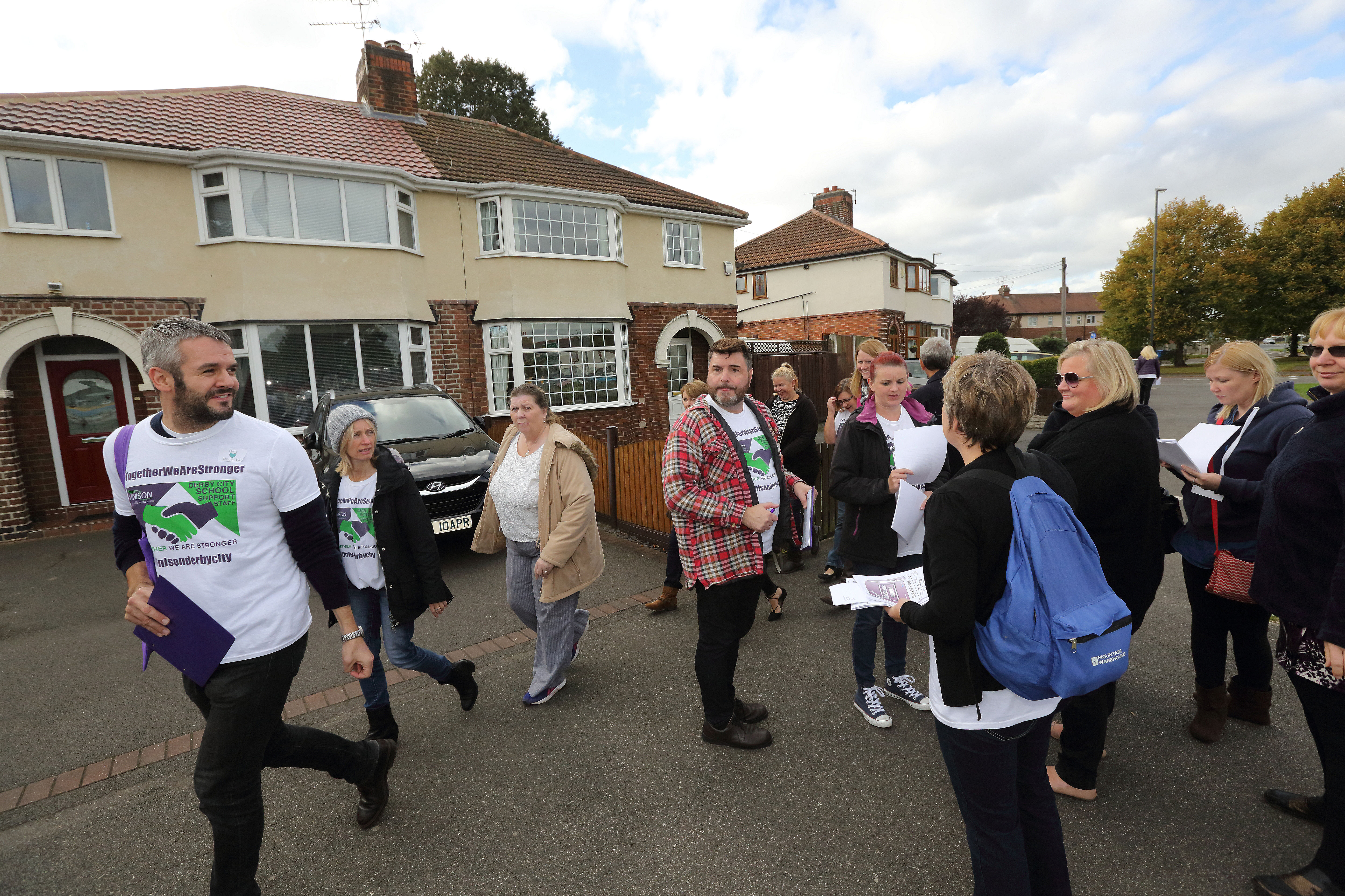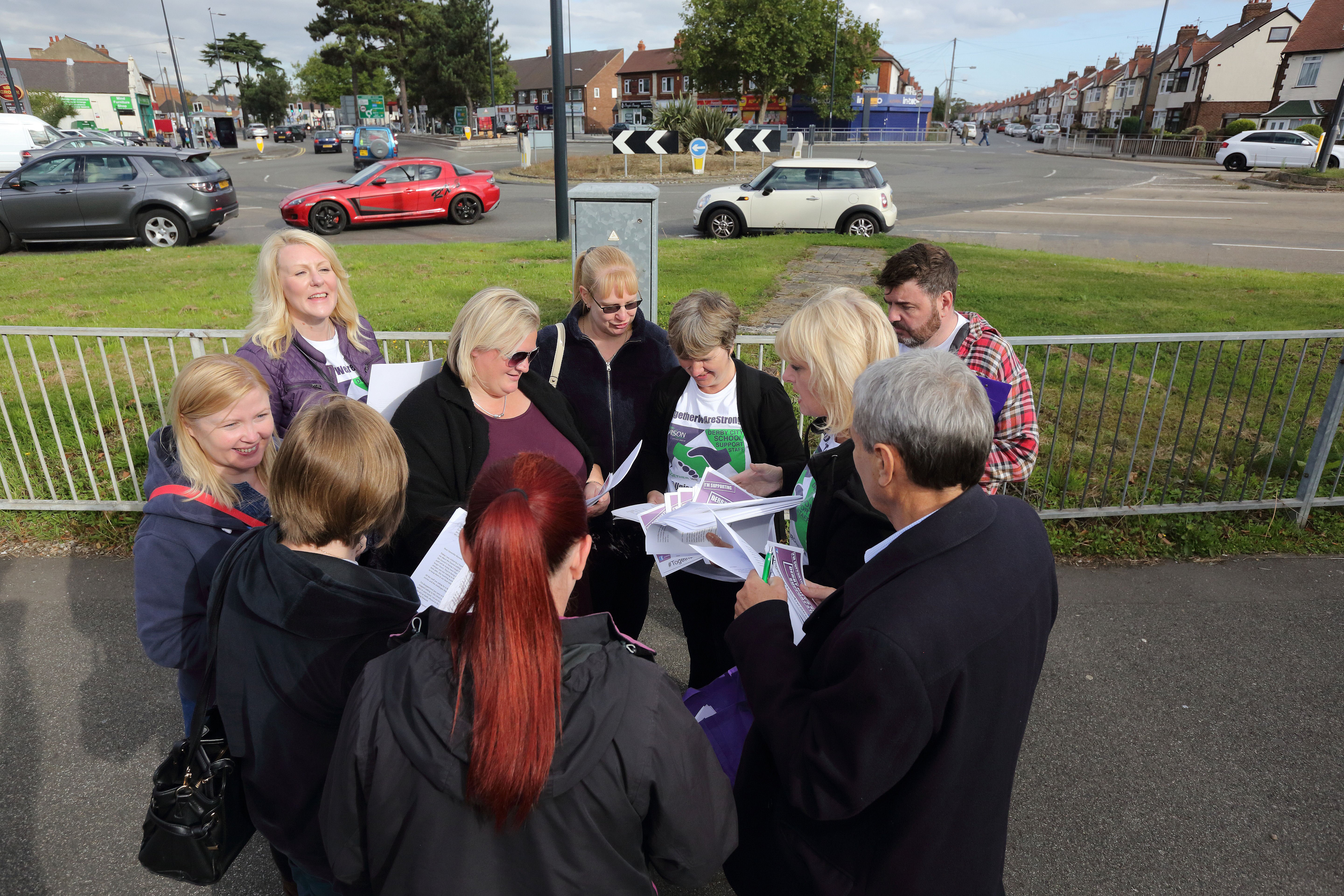 The 150+ striking School Support staff met at the Blue Peter pub for a quick brunch and briefing. They then split into 15 groups who systematically walked round the whole of Banwait’s Boulton ward, knocking on doors, explaining the nature of the dispute, asking for signatures, encouraging them to write to Cllr Banwait…and spreading the word.