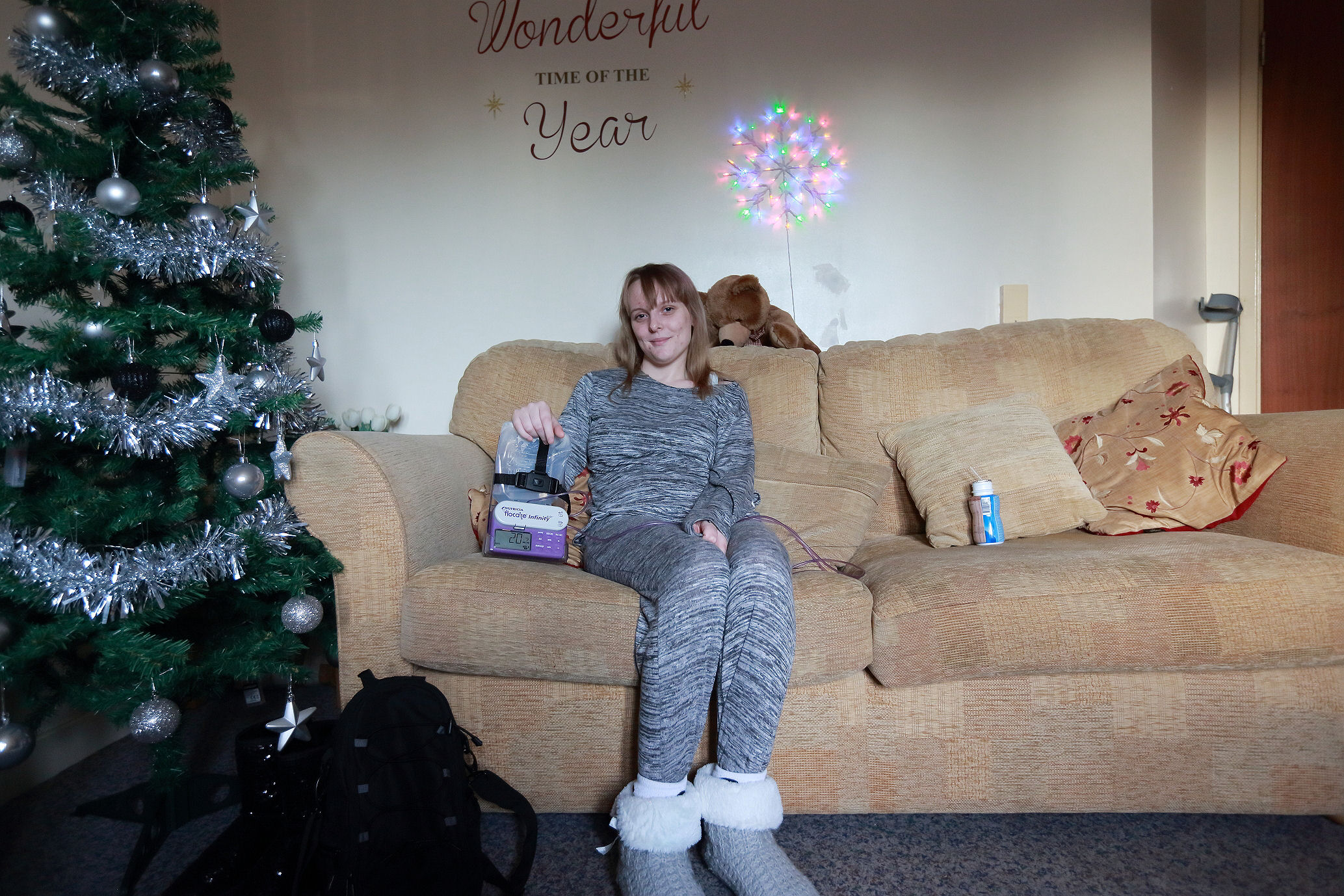 During this interview I had noticed that she was attached to a unit that was pumping liquid into her stomach – it runs 24 hours a day to combat her problems with fluid and nutrition absorption. When I came to take a photo, I asked her if she was ok if it was in the picture –“Yes”, she said, immediately, picking it up off the floor, giving it a small hug “This is part of me!”
