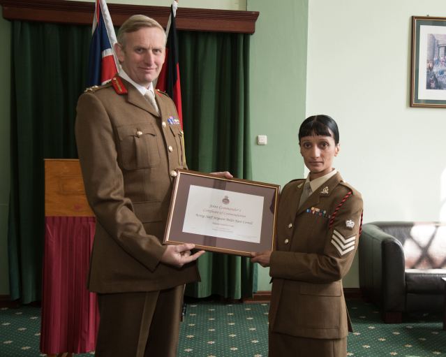 Upon receiving the Joint Commander’s Commendation from Major General Richard James Aethelstan Stanford MBE, GOC Regional Command, in the NATO Officer’s Mess in Sennelager, Germany, Acting Staff Sergeant Baljit Kaur Cornell said: “The Army allows me to travel the world and experience amazing adventures. I’ve worked alongside many exceptional officers and soldiers in challenging and competitive environments. That alone is very rewarding for me.”