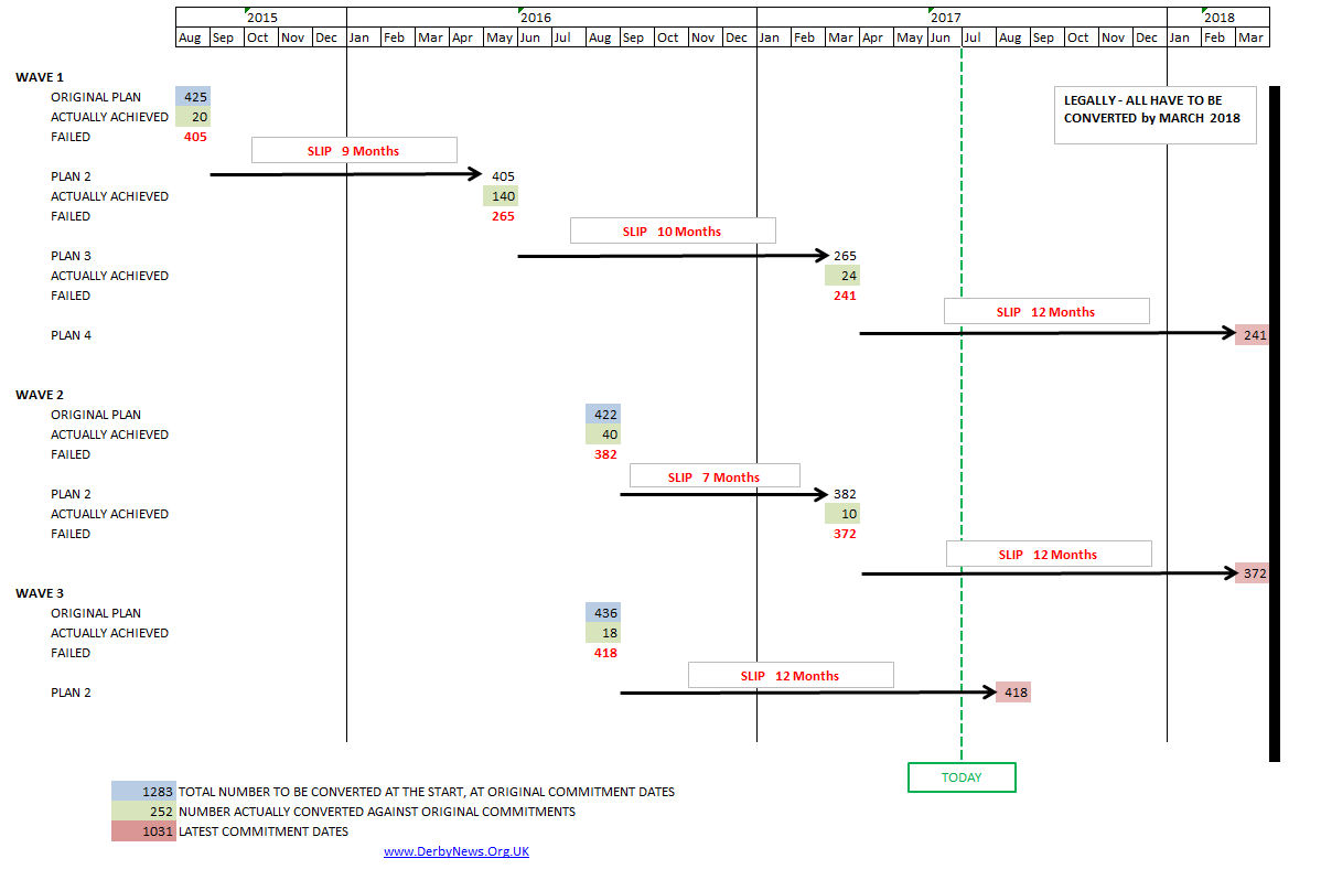 The latest re-committed plan (December 2016) was for 647 to be completed by March 2017 (FOI 9419). They actually delivered 34. The remaining 613 have been slipped to March 2018 – that is the latest possible legal allowed date (FOI 10068)