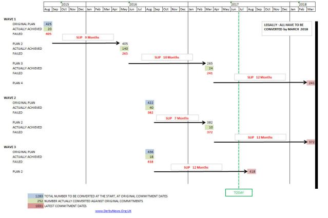Cllr Russell ( Cabinet member for Education) has re-assured the Council on a number of occasions that, despite the start being poor, that it is now “improving”. The Council has not been short of funding. Specific grants have been given by Central Govt since the start of this programme amounting to £1.1m ring-fenced to deliver these conversions. To further assist, from October 2015-October 2016 a consultant was employed for £77350 to provide more resource. Yet, none of this seems to have secured the right progress against the plan