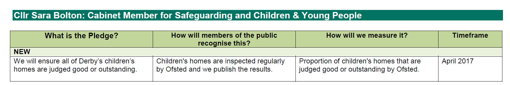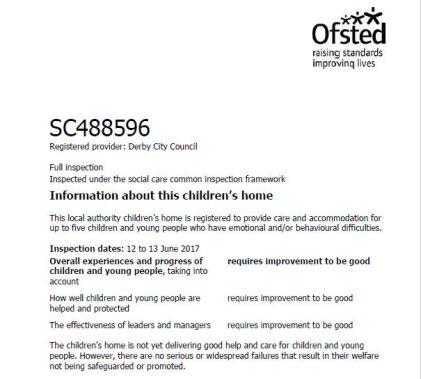 “…we have pledged to ensure that all of Derby’s children’s homes are judged good or outstanding by Ofsted. I am pleased to report that six of our homes currently meet this target, while we are awaiting an outcome on the seventh.”