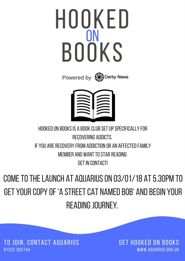 In conjunction with Aquarius ( charity helping recovering addicts, and families), based on Wilson Street in Derby, the project will be launched on 3rd January 2018 5:30pm called “Hooked on Books”. The format is that each participant will be provided with a brand new copy of the book at the beginning of each month – the first one being ” A Street Cat named Bob”, and then 4 weeks later the group will meet up, have a discussion, share what they experienced, what they felt etc. Over time the idea is that the group will decide the titles which they’d like to read.
