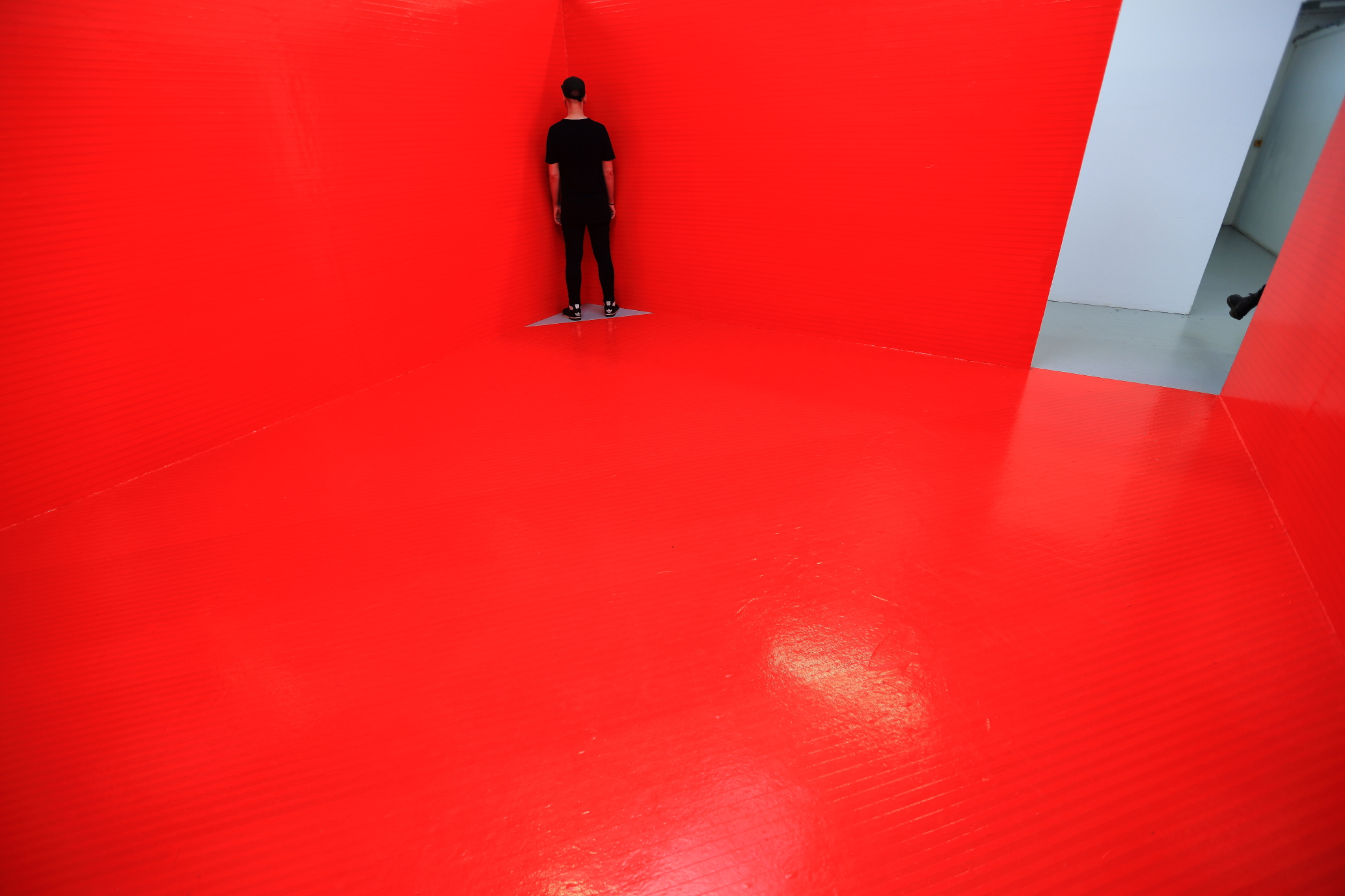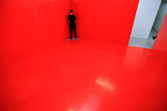 In his latest work, called “Paradox”, Pierce takes these ideas one stage further.  In the 1st phase of the work, the white exhibition  space was systematically covered on all sides with red tape, leaving a small triangle in one corner. Each layer of tape represented “the stifling layers of protocol”