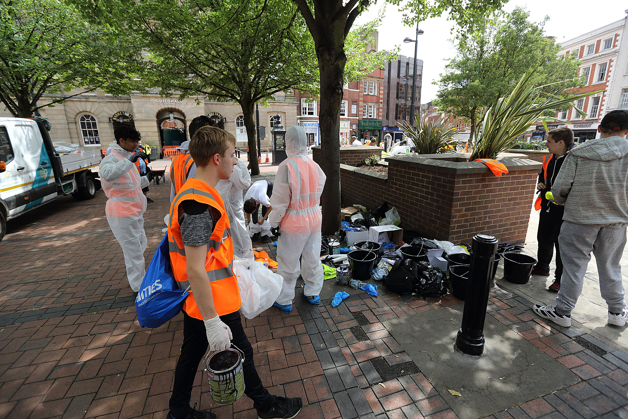 The day consisted of slab cleaning, removal of chewing gum, stains. painting street furniture, pruning shrubs, planting flowers/hanging baskets, tidying up planting areas and a basic scrub down.
