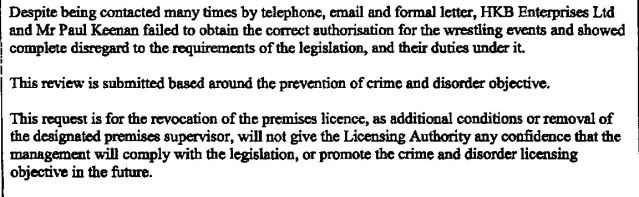 The application cited that on 3rd May 2018, at Southern Derbyshire Magistrates Court both HKB Enterprises Ltd ( company that runs The Hairy Dog), and Paul Keenan ( Designated Premises Supervisor [DPS] – day to day manager) pleaded guilty to 1 offence, and 3 offences, respectively, under the Licensing Act of allowing unauthorised licensable activities , namely pro-wrestling from June 2017 – October 2017. Both parties were fined.