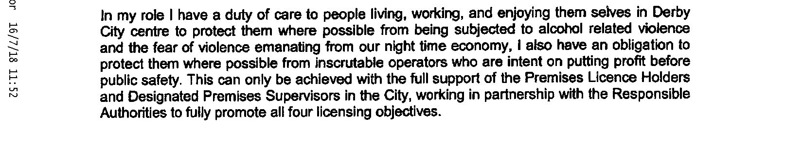 Jason Dickens, Deputy Chairman of Derby City Pubwatch, sent a letter for inclusion at the hearing, dated 20th July 2018. Pubwatch has 40 members in the City Centre which: