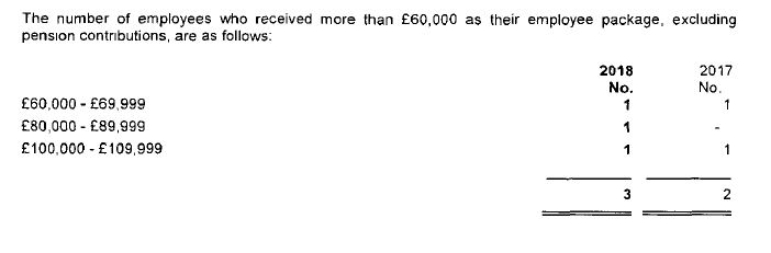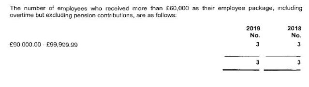 The 2019 accounts state that 3 people received a salary of between £90,000 and £99,999.99 in both 2019 and 2018.