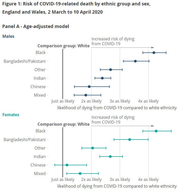 “Black men and women are respectively 4.2 and 4.3 times more likely to die from coronavirus than their white peers in England and Wales. The risk of death for Britons of Bangladeshi and Pakistani origin is more than three times higher, while those from Chinese and mixed ethnicities are around twice as likely to die from the virus.”