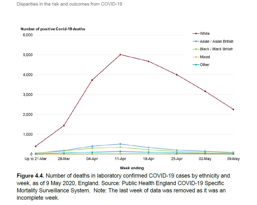 “Death rates from COVID-19 were highest among people of Black and Asian ethnic groups. This is the opposite of what is seen in previous years, when the mortality rates were lower in Asian and Black ethnic groups than White ethnic groups. Therefore, the disparity in COVID-19 mortality between ethnic groups is the opposite of that seen in previous years” (p6)
