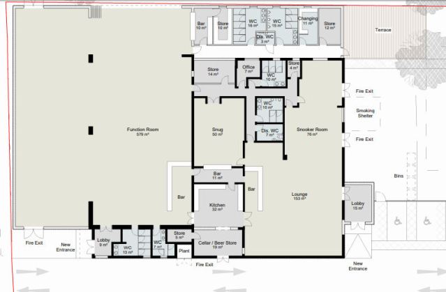 The existing building will be extended on the road side, creating an additional 325 sq metres, catering for 500 people. 2 new entrances will be created, one providing access to the function room and the other one, to the lounge. There will be additional toilets, and improved access for disabled people