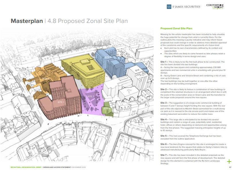 In February 2020 the Council’s Planning Committee approved an outline planning application brought by St James Securities for the whole of the Becketwell area. A significant multi-phased project, starting with the demolition of the Debenham’s building ( Site 1 – brown area – in the Master Plan below)
