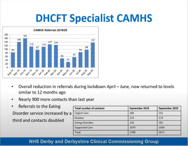 Whilst urgent referrals are seen the same day, those that are more routine are now having to wait, on average, 21 weeks (Sep 2020) – the longest is 57 weeks. This average is up from 14 weeks in September 2019. The number of children waiting is 342, down from 432 a year ago.  This reduction is likely to result from a combination of the drop off in referrals during the April -June lockdown period, and the implementation of Targetted Intervention.