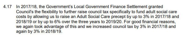 The strategic direction in that paper was to increase the Council Tax by the maximum level possible for “good financial reasons”. This is particularly important, given that the Council has had to draw on reserves over the last few years to “balance the budget” and there is the well publicised shortfall in Adult Social Care funding.