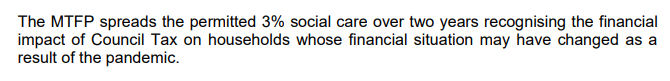 For this coming year, 2021/22, the Council’s draft Medium Term Financial Plan/Budget (MTFP) proposes to increase Council Tax by 4.49% – not the maximum of 4.99%, contrary to the strategy. The rationale being :