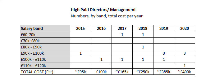 Directors/Management salaries – whilst the total number of people has only increased from 11 to 13 people, the total cost has more than doubled (118%) with the average annual salary increasing by 85%. ( compared to staff whose salary has increased by  just 15% over 5 years). The highest paid staff/ directors is more significant.