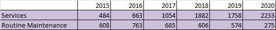 The assumption is that the H20 “maintenance service” cost is being shown in “Services”,  in the accounts, not “Routine Maintenance, hence the growth in the number. The material drop in “Routine Maintenance”,  only in 2020,  when the number of properties increased is unexplained.