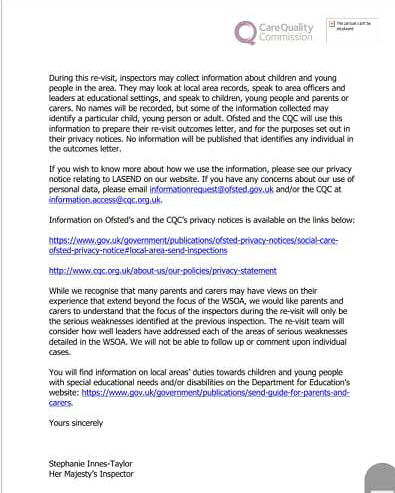 In addition to talking with the Schools, and Council staff, OFSTED/ CQC look to parents, and families to input their experiences and comments. This gives a degree of balance, realism and integrity to the inspection