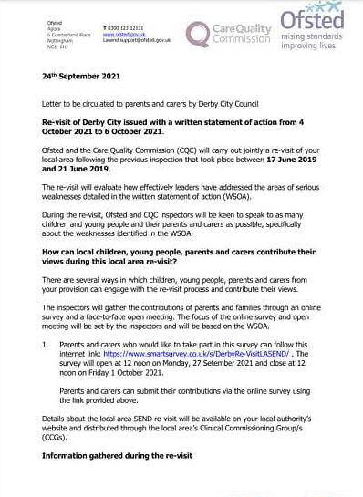 On the 24th September 2021, the Council received a letter from OFSTED/CQC “…to be circulated to parents and carers by Derby City Council” which advised of