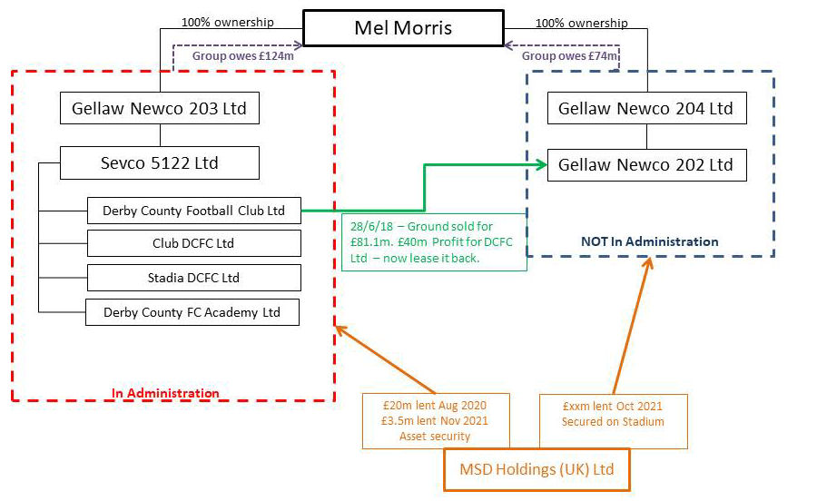 In November 2021, Mel Morris’ company (Gellaw Newco 202 Ltd) that owns Pride Park stadium, borrowed an undisclosed sum from MSD UK Holdings secured against the Stadium. The debenture (security document) also refers to the Administrators.