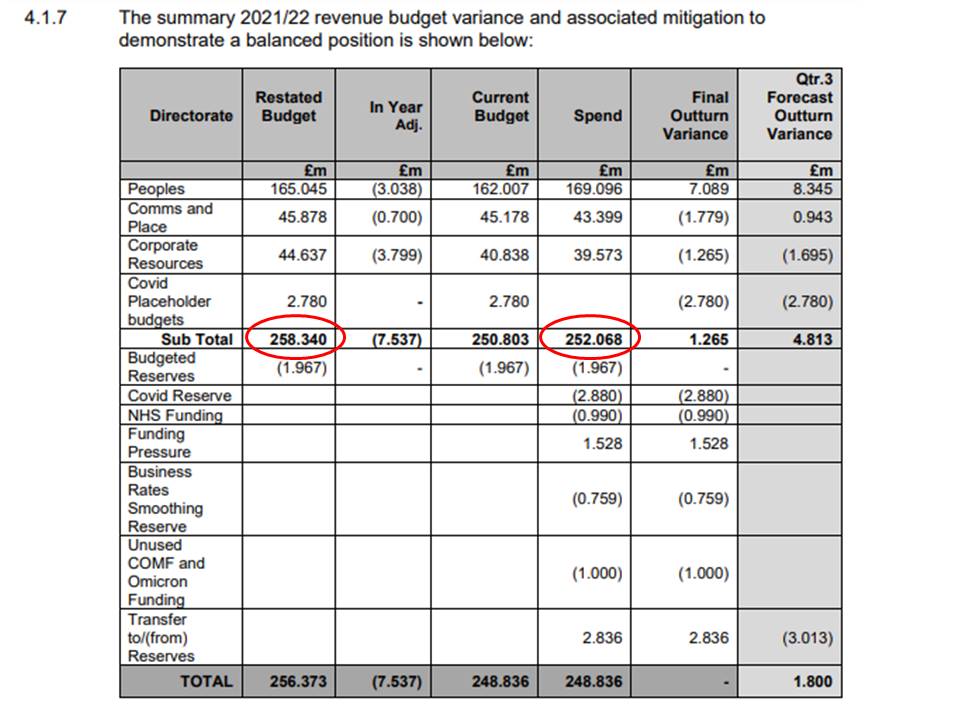 The actual spend of £252.068m then shows an overspend of £1.265m against this reduced budget.