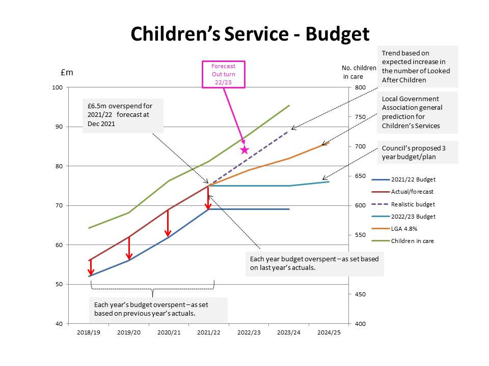 In my article of 27 February 2022 “5 Reasons why Councillors should reject this “travelling hopefully”Budget”” the following chart (updated) predicted that the Children’s Service Budget for 22/23 should have been around £82m and not £75m. This was based on historical growth ; the Local Government Association also suggested a much higher number to the one used in the Budget
