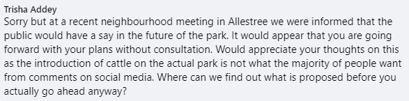 In the weeks prior to this announcement they had had discussions with DCC and the Friends of Allestree Park (FOAP) group who had advised that their discussions should be followed up with a proper public consultation / Q&A session.