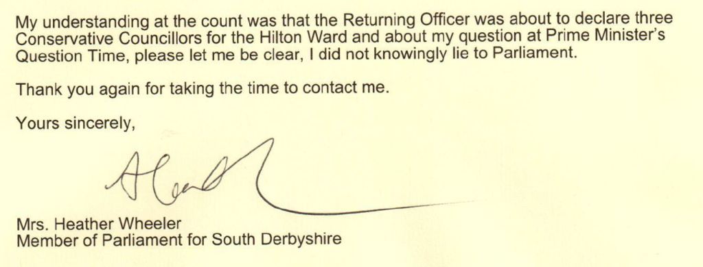 Had Heather Wheeler wanted to be sure of the accuracy of her statement to Parliament she could have contacted the Returning Officer, directly, like I did – I got a response in 40 minutes!