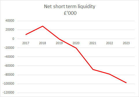 At 31 March 2018, the Council’s net short term liquidity was £28.3m. In the subsequent 5 years that position deteriorated, year on year, to the extent that the Council has a negative net short term liquidity of £97.4m!