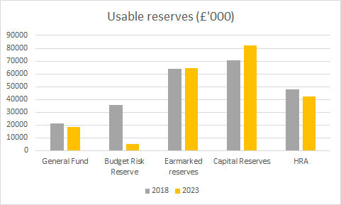 The consequential effect of the above financial mismanagement, on the balance sheet, is a £26.7m reduction in usable reserves which is predominantly in the Budget Risk Reserve ( used to fund in year overspends). This reserve dropped by £31m from 2018 – 2023; it is forecast to fall by a further £5m, to zero, by 31 March 2024 based on current projected overspends. A total reduction of £36m in 5 years!