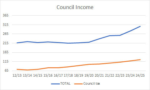 Of the £306m for 24/25, only £125m comes from the Council Tax, the rest comes from Business Rates (£61m) and the balance (£120m) comes from various Central Government grants.