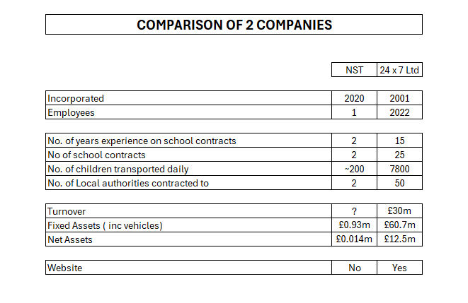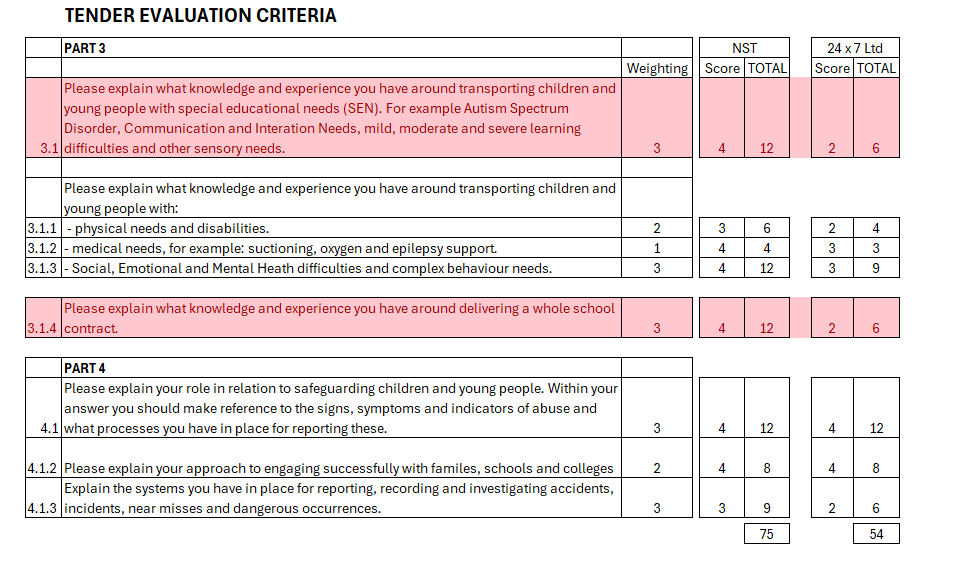 There is no evident strict procedure for how the points should be awarded. It is noteworthy that 2 of the questions were assessed at 4 for NST, and 2 for 24 x 7 Ltd. This would suggest that 24 x 7 Ltd had substantially less experience than NST in transporting SEN children, and on fewer whole school contracts. Generally it would suggest that 24 x 7 Ltd was more limited in resources.