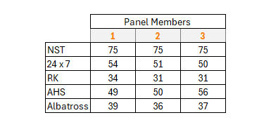 NST were awarded 6 perfect scores (4 out of 4) from 8 questions by all 3 Panel Members; 24 x 7 received a unanimous perfect score for just 2 of the 8 questions.