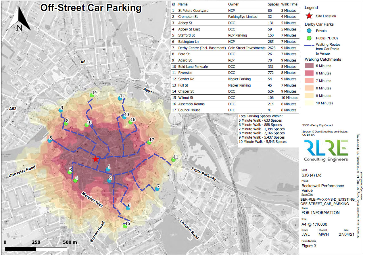Since this was published in 2021, the Riverside Car Park (772 spaces) has closed, a planning application has been approved which will reduce the capacity of the Derbion basement car park by ~50% (1300 spaces) and the Assembly Rooms car park will be demolished (214 spaces).