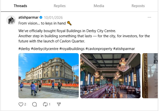 In January 2026, the Royal Buildings in Derby city centre, was sold to Cavendish and London Property Group Ltd. It was sold by Clowes Developments for an undisclosed sum. The Buildings is home to a number of organisations, including the Cosy Club.